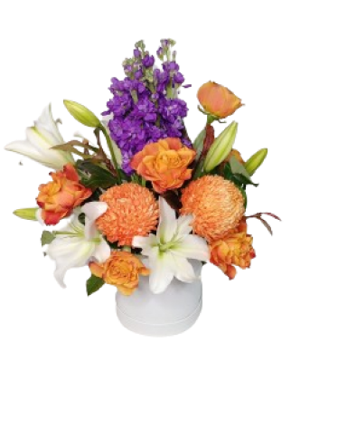 Expertly crafted with vibrant orange roses, chrysanthemum, and white lilies, complemented by the deep hues of purple stock flower box. This stunning arrangement by Joanna brings a touch of sophistication and beauty to any occasion. Elegant and eye-catching, it is sure to make a statement and impress any recipient.